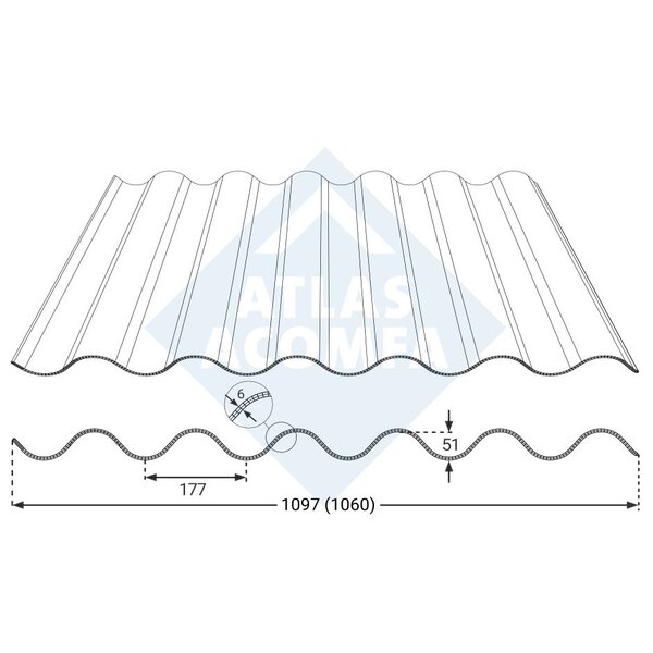 Deze driewandige golfplaat van polycarbonaat heeft een breedte van 110 cm, een werkende breedte van 106 cm en een lengte van 490 cm. De type F golf heeft een hoogte van 5,1 cm en een breedte van 17,7 cm.